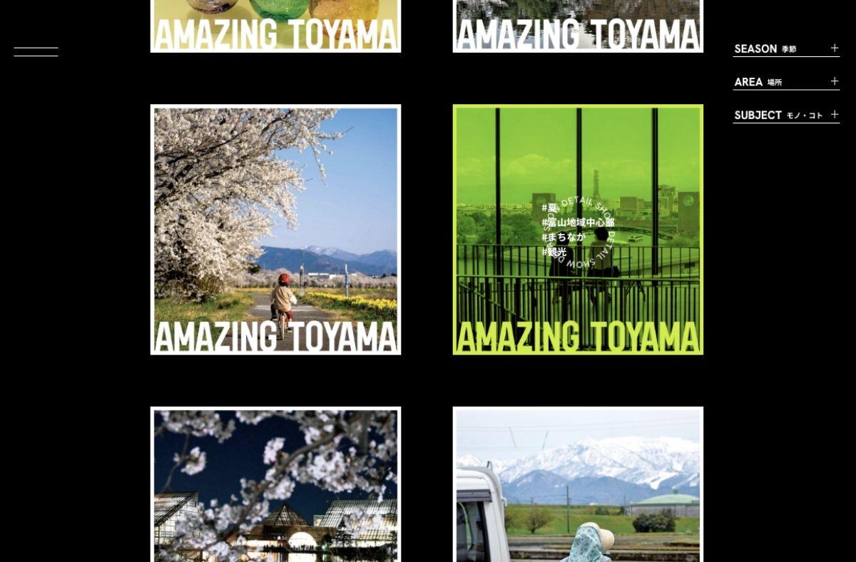 サイトにアクセスした瞬間、ファーストビューでは「AMAZING TOYAMA」の文字で視覚的なインパクトを与え、閲覧者の目を惹きつけます。