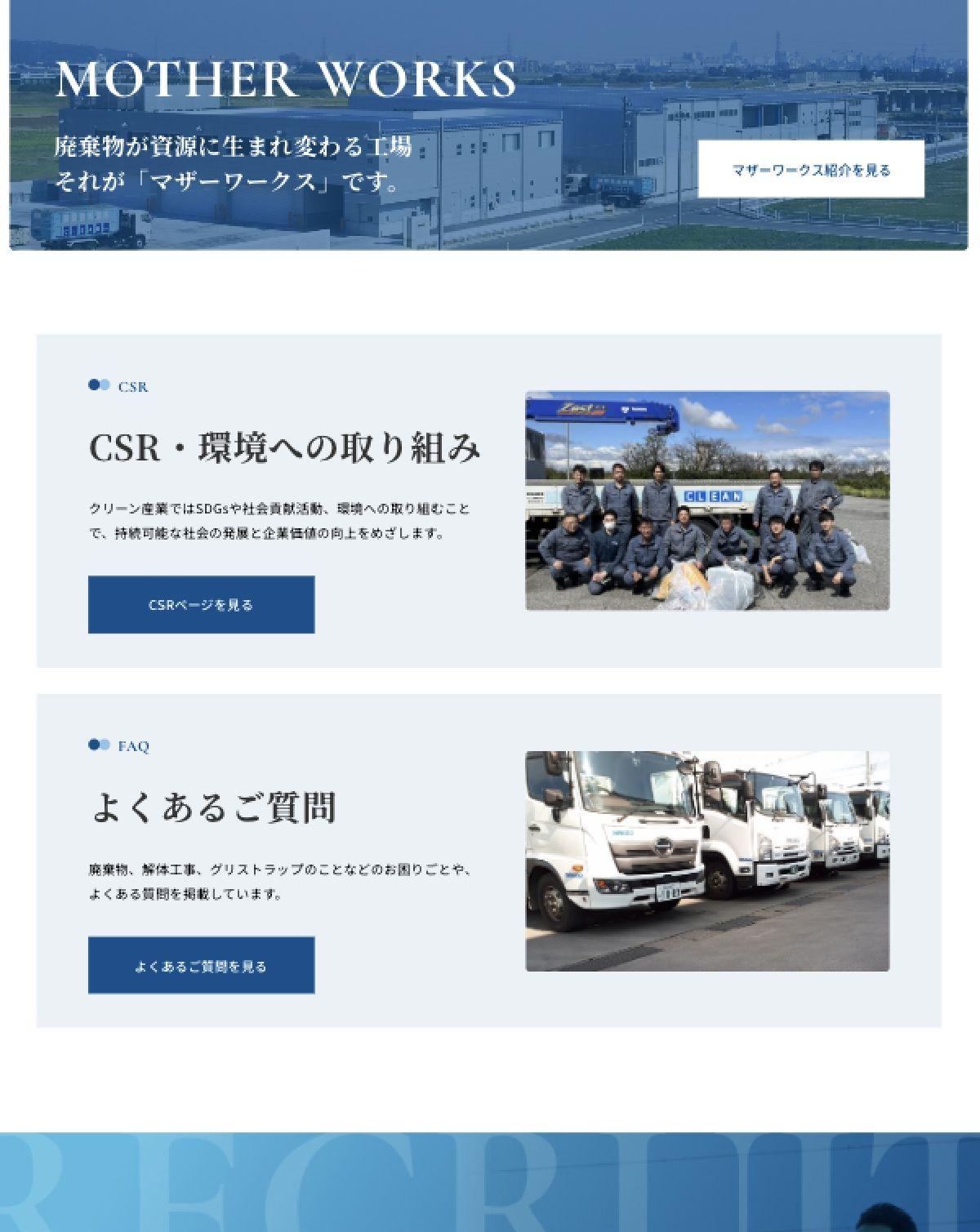 親しみやすさを出すため、トップページに街のイラストを配置し、その中でクリーン産業が働く様子をアニメーションで表現しました。街の至る所で働く身近な存在として、やさしさと親しみを伝えています。