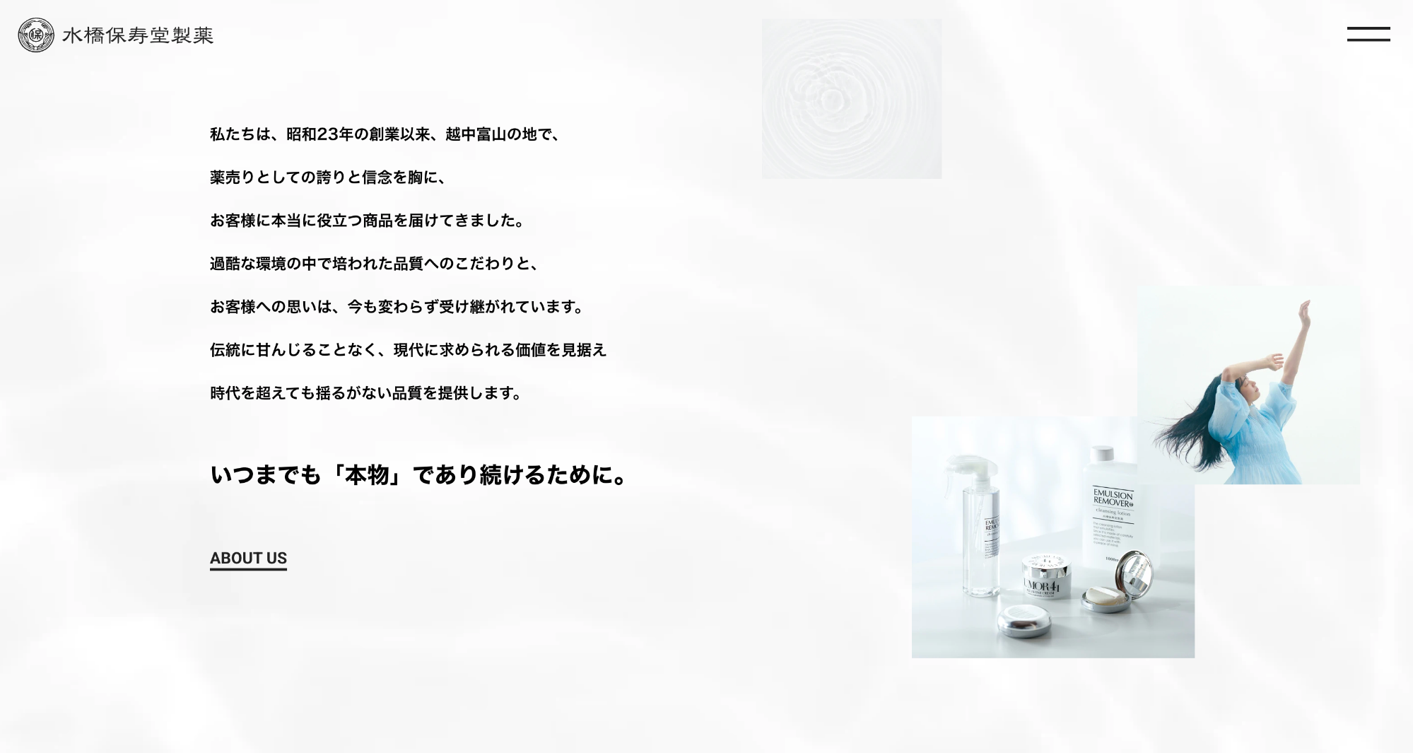 この3つの価値観を、コーポレートサイト全体のトーンやビジュアルに丁寧に落とし込み、水橋保寿堂製薬様が日々大切にしている姿勢を、静かに、まっすぐに伝える構成を意識しました。