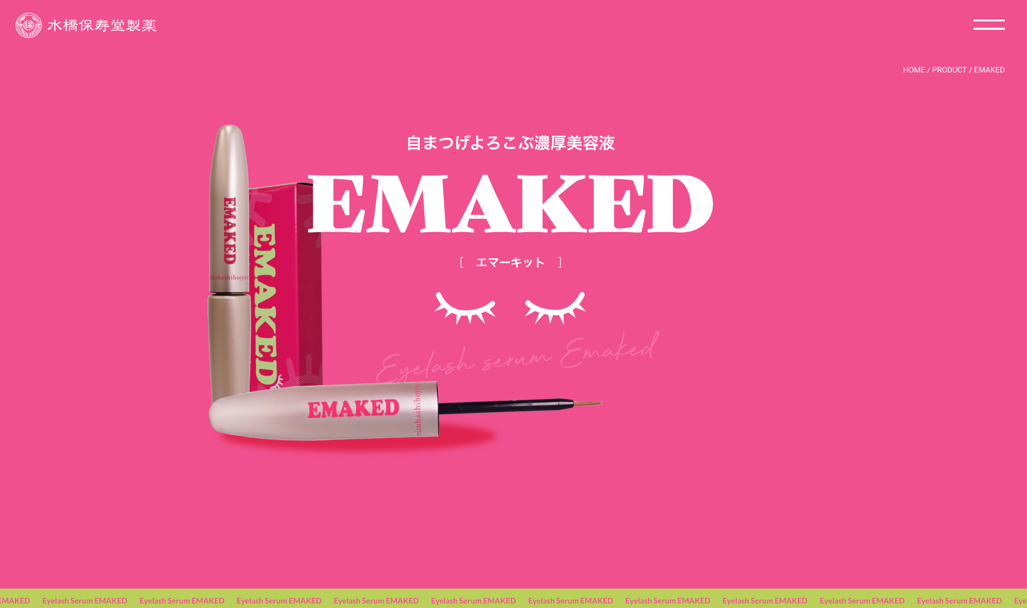 たとえば『EMAKED』の商品ページでは、ビビッドなパッケージカラーを活かし、商品の個性が際立つように設計。ランディングページのように訴求力の高い構成で、商品の魅力が一目で伝わるよう制作いたしました。