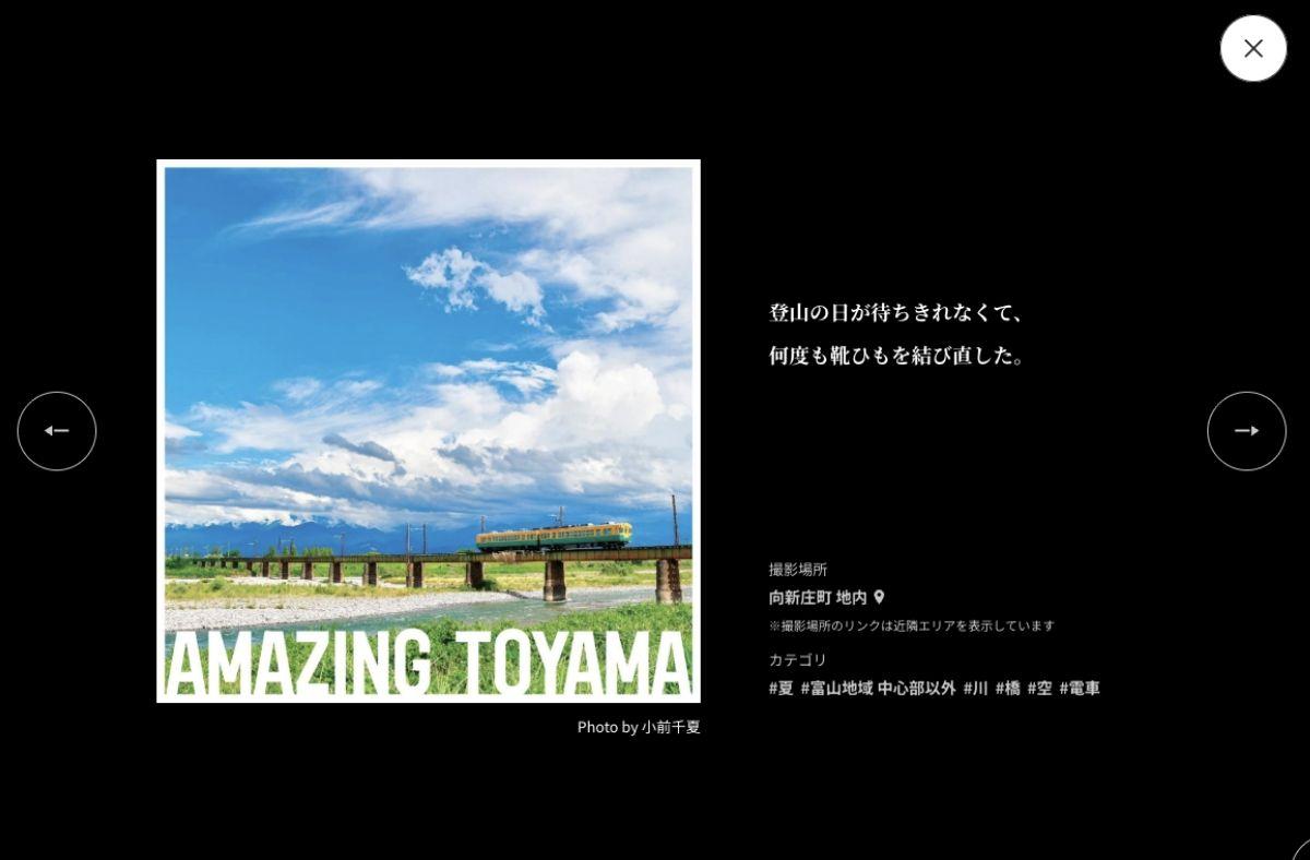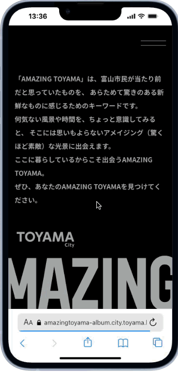 「AMAZING TOYAMAフォトアルバム」の制作では、デザイン・UX・システムのそれぞれの面から、富山市のシティプロモーションを支えるお手伝いをしました。