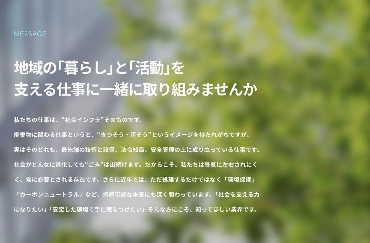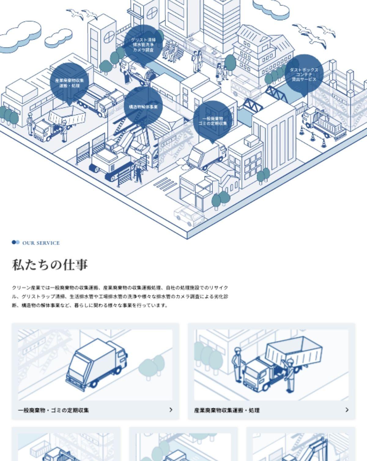 親しみやすさを出すため、トップページに街のイラストを配置し、その中でクリーン産業が働く様子をアニメーションで表現しました。街の至る所で働く身近な存在として、やさしさと親しみを伝えています。