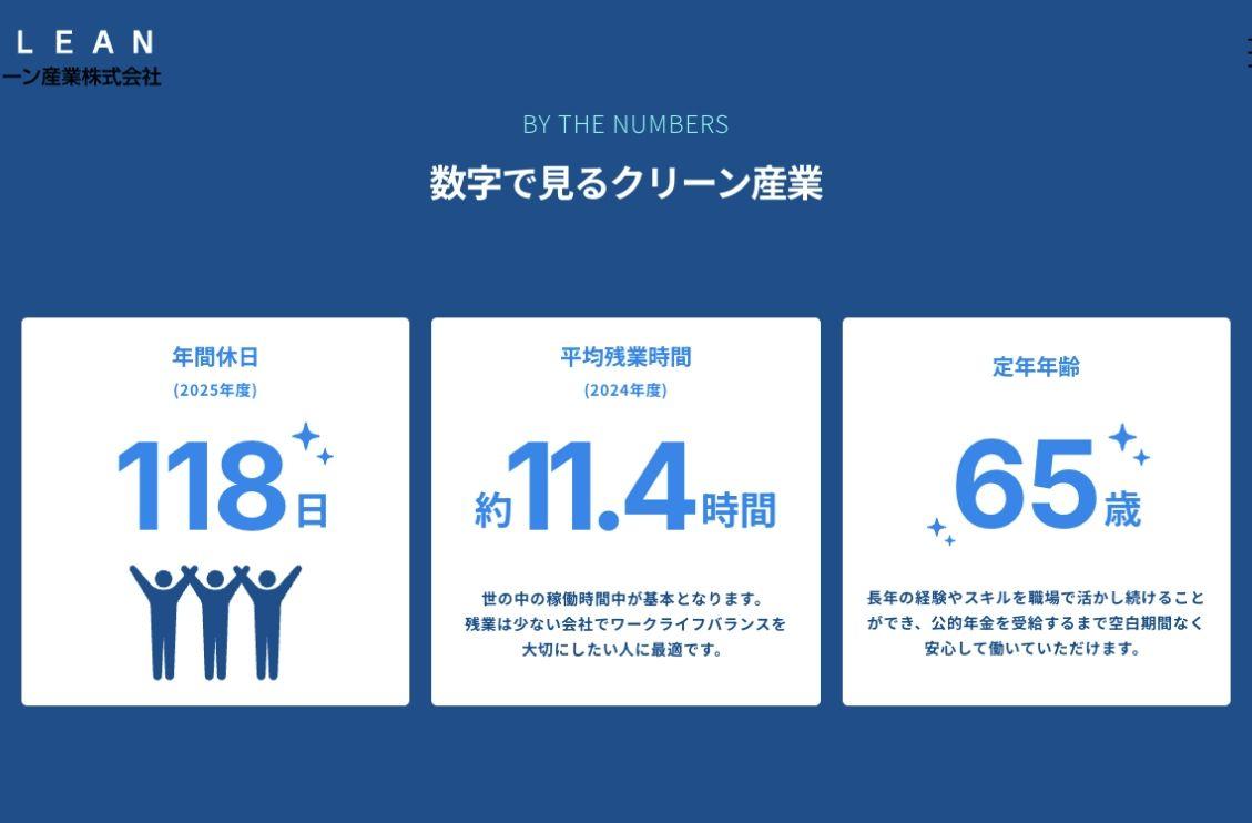 採用ページでは、メインサイトからトーンを少し変え、より親しみやすい雰囲気にしました。 現地で撮影した社員の様子や職場の雰囲気を見せながら、年間休日や福利厚生は数字で具体的に伝えています。