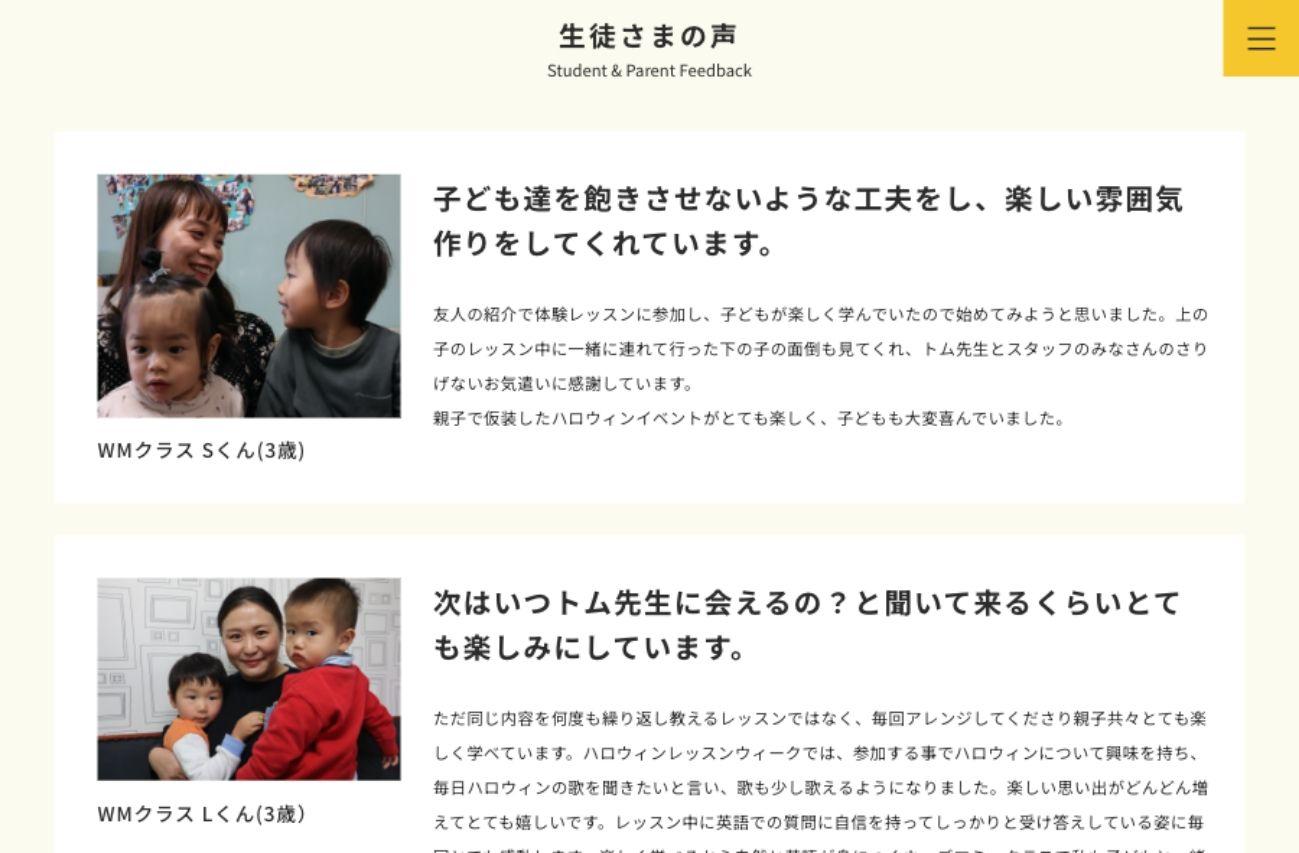 その上で、教室での日常風景やイベントの写真を織り交ぜながら、トム先生がどんな想いで子どもたちと向き合っているのかを伝えています。そして最後に、実際に通われている保護者の声を掲載。「うちの子、こんな風に変わりました」という具体的なエピソードが、何よりの説得力になっています。